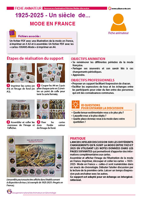 A l’occasion de ce quart de siècle, nous vous proposons chaque mois de faire une rétrospective des changements survenus depuis 1925 dans différents domaines. Ce contenu va permettre aux aînés de se remémorer, de découvrir ou redécouvrir des faits et changements survenus durant ce siècle passé. Après les premiers parus sur le progrès en France, la littérature et la médecine, c’est à la mode d’être mise en avant. Ce support composé d’une grande image symbolisant la mode, de cartes événements à coller, peut-être exposé dans votre établissement après l’avoir utilisé lors d’ateliers-discussion. Dix cartes renseignent sur les différents courants de la mode au cours du siècle. La fiche animateur comporte des éléments complémentaires à ces cartes pour agrémenter l’atelier.