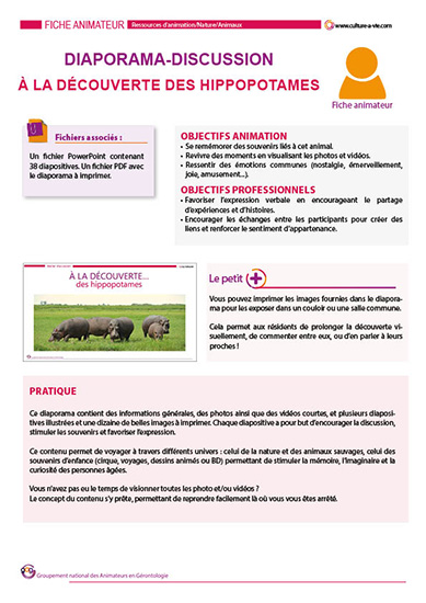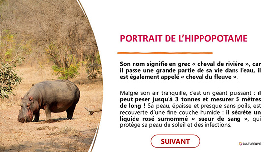 Ce diaporama, accompagné de sa fiche animateur, vous emmène à la découverte de l’hippopotame. Ses caractéristiques avec quelques infos insolites, des vidéos, un quiz et de belles images à imprimer pour continuer la discussion dans la structure autour de cet animal impressionnant. Le diaporama est disponible en format PDF mais il ne contient pas les vidéos.