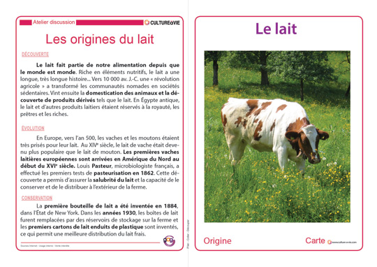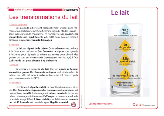 Des cartes reprennent l’origine, la transformation, l’utilisation et la consommation de lait en France et dans le monde, pour ensuite répondre à un diaporama quiz et une fiche mots croisés. Ces supports sur cette boisson donneront sans nul doute lieu à de nombreux souvenirs. N’oubliez pas de « dézipper » le diaporama avant de le projeter en faisant un clic droit « Extraire tout ».