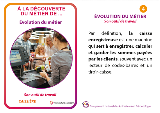 Nous proposons de plonger les aînés dans l’histoire fascinante des métiers anciens à travers une animation immersive et interactive. Ce cinquième contenu est consacré au métier de caissière de supermarché.