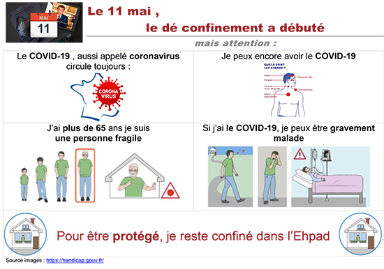 Mryriam a conçu une affiche à mettre dans la chambre des personnes qui ont des problèmes de compréhension ou qui oublient les informations. En effet, certains résidents avaient intégré que le 11 mai eux aussi pourraient être "déconfinés". Nous savons malheureusement que ce n'est pas le cas !En la laissant visible dans leur chambre, cela limite les déambulations.