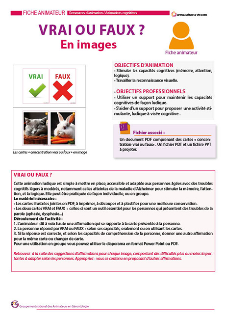 Cette animation ludique est simple à mettre en place, accessible et adaptée aux personnes âgées avec des troubles cognitifs légers à modérés, notamment celles atteintes de la maladie d’Alzheimer pour stimuler la mémoire, l’attention, et la logique. Elle peut être pratiquée de façon individuelle, ou en groupe. 10 images sont présentées et la personne doit choisir la carte Vrai ou Faux en fonction des affirmations données par l’animateur-rice.
