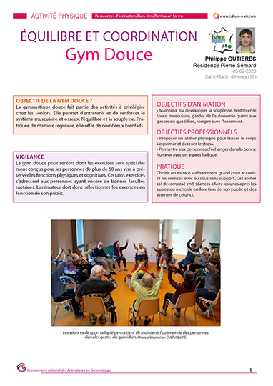 Philippe propose des activités de gym douce. Coordination, parcours, équilibre et relaxation sont ainsi détaillés avec échauffement et étirements. Ces séances visent à renforcer le tonus musculaire afin de conserver un maximum d’autonomie. L’animateur sera vigilant à choisir les exercices en fonction des capacités des participants car certains exercices s’adressent à des personnes ayant de bonnes facultés motrices et/ou un bon équilibre.
