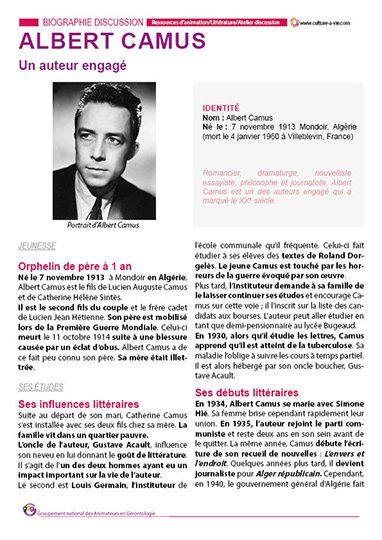 Cette biographie permet de retrouver le parcours de vie de cet écrivain célèbre ainsi que son parcours littéraire et ses œuvres majeures jusqu’à sa mort en 1960. Romancier, dramaturge, philosophe et journaliste, Albert Camus a laissé des ouvrages très célèbres comme L’étranger ou La peste. La biographie est complétée d’un quizz photos permettant de retracer les moments forts qui ont marqué sa vie.