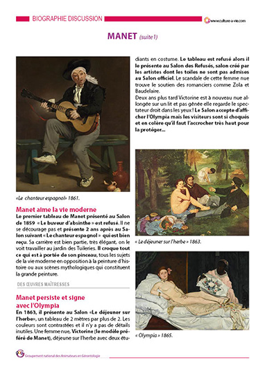 La vie du peintre. L'histoire de sa peinture et son évolution avec les œuvres qui ont marqué sa carrière. La biographie est complétée d'un quizz photos comprenant 5 questions sur l'artiste accompagnées de photos. Un support adapté à une animation individuelle.