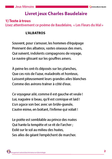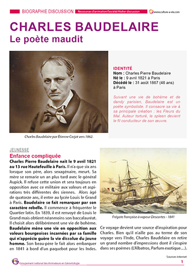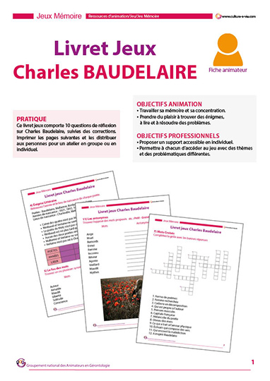 2021 célèbre les 200 ans de la naissance de Charles Baudelaire (né en 1821). Deux contenus fêtent le poète : une biographie suivie d’un atelier photos/discussion et un livret jeux. Le livret-jeux comportent 11 questions, mots croisés, énigmes, poèmes à trous… De quoi ravir les passionnés de Baudelaire. Les réponses sont données à la fin du livret. Ces contenus conviennent à des animations individuelles.