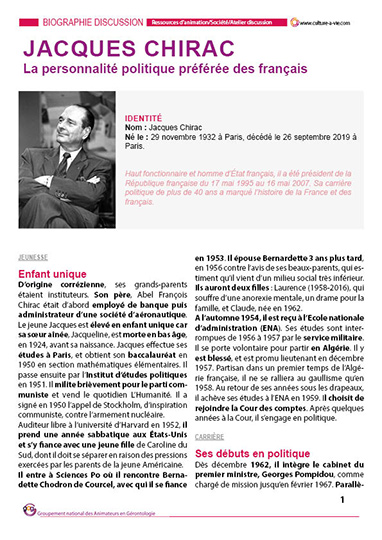 Suite au décès de l'ancien Président de la République Jacques Chirac survenu le 26 septembre 2019, retrouvez dans cette biographie les faits marquants de sa vie et de sa carrière politique. Ce support vous permettra d'alimenter les échanges autour d'événements nationaux entre 1962 lors de ses débuts en politique jusqu'en 2007 lorsqu'il quitte la présidence de la République. Une fiche question à la fin de la biographie vous permettra de tester les connaissances des aînés sur la vie de cet homme publique.