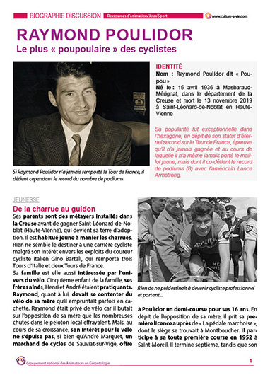 Cette biographie retrace la carrière professionnelle de ce cycliste très populaire décédé le 13 novembre 2019. Raymond Poulidor, surnommé Poupou ou l'éternel second a marqué le cyclisme par ses 189 victoires mais aussi par sa malchance à terminer souvent second du Tour de France.