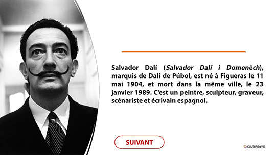 Afin de célébrer l'un des principaux représentants du surréalisme (né en mai 1904), partons à la découverte de Dali, l’artiste inventeur de la méthode paranoïaque-critique. Le diaporama proposé ici permet de retrouver les grandes étapes de sa vie à travers des questions suivies de réponses à choix multiples.