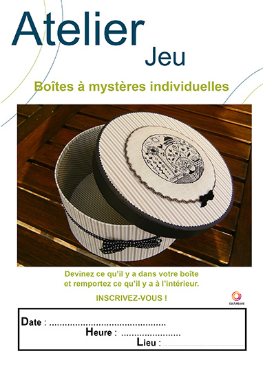 Pour éviter les manipulation d’objets entre les personnes Christelle a eu l’idée de transformer le concept de la boîte à mystère. Le principe est simple : chaque participant a une boîte contenant un objet. A lui de deviner son contenu pour le gagner en posant des questions. Un support ludique pour faire travailler la réflexion et la déduction. Ce jeu peut être utilisé pour les fêtes de Noël pour remettre les cadeaux aux résidents d’une autre manière.