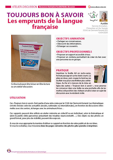 Aurélie partage des petites informations du quotidien que nous avons choisi d’appeler les TOUJOURS BON à SAVOIR. Elle les utilise soit en atelier collectif soit en individuel. Selon la thématique des objets peuvent être exposés ou des photos en grand format pour plus de visibilité et selon le public ciblé (personnes présentant des troubles neuro-évolutifs…)).