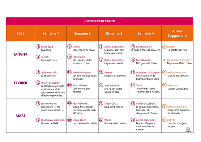 Prérempli pour les mois d’hiver, ce calendrier à imprimer présente 24 contenus d’animations. Il servira à mettre en place des ateliers discussion ou activités manuelles où les participants pourront s’exprimer sur le thème de l’hiver et des fêtes associées à cette période. Ce support modifiable peut être personnalisé selon les envies de chacun. Ce tableau est un outil de recueil et d’organisation qui aide à maintenir un calendrier varié et adapté aux attentes des résidents, en veillant à ce que chaque catégorie d’activité soit représentée et en lien avec les souhaits et envies de chacun.