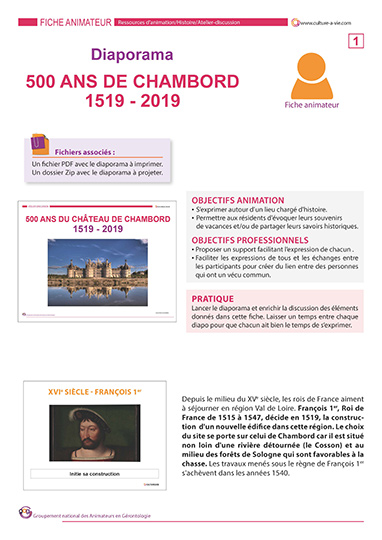 A l’occasion des 500 ans de ce château de la Loire (château construit en 1519 à l’initiative de François 1er), retrouvez un diaporama décrivant les grandes caractéristiques de cet élément architectural. Pièces, architecture, décoration, jardins, forêt sont ici détaillés pour raviver des souvenirs de visites ou alimenter une discussion sur le patrimoine français. N’oubliez pas de « dezipper » le diaporama avant de le projeter en faisant un clic droit « extraire tout »