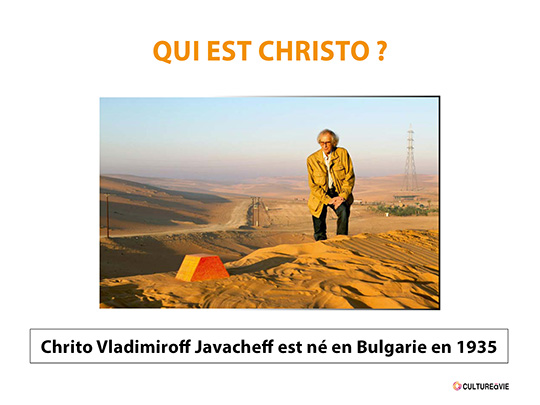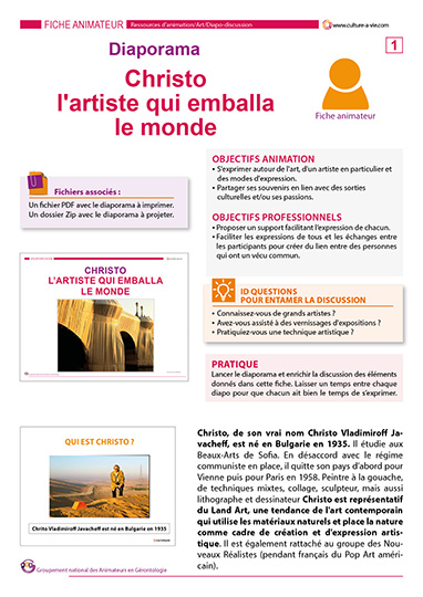 Connu pour ses œuvres éphémères monumentales où il emballe de toiles et de cordes des monuments, des côtes ou habille des îles, l’artiste bulgare s’est éteint 3 mois avant son projet d’envelopper l’Arc de Triomphe en septembre 2020. Ce diaporama retrace les principales œuvres de cet artiste qui travaillait avec sa femme depuis 1958. Une fiche animateur vous permettra d’apporter plus de détails aux personnes lors de cette présentation.