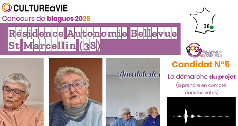 Voici la vidéo du cinquième participant au concours de blagues et anecdotes. Il s'agit de la résidence autonomie Bellevue à Saint-Marcellin en Isère.