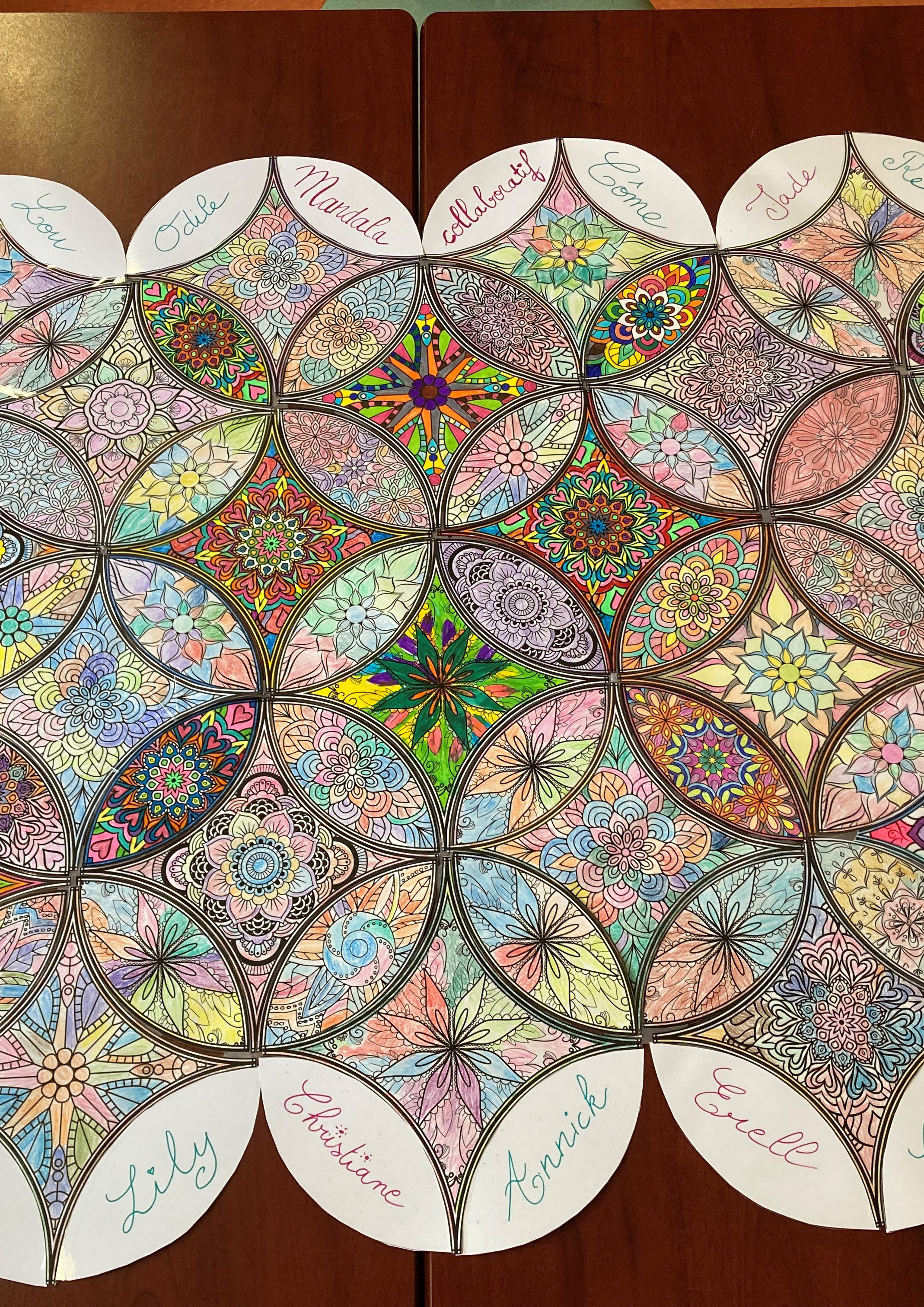 Pour rendre cette activité plus collaborative, j'ai proposé aux enfants du personnel et petits enfants des bénévoles de participer à cet atelier durant les vacances d'été. Une fois plastifié et affiché dans l'entrée du service, nous avons écrit les noms de participants tout autour afin d'harmoniser le rendu final.