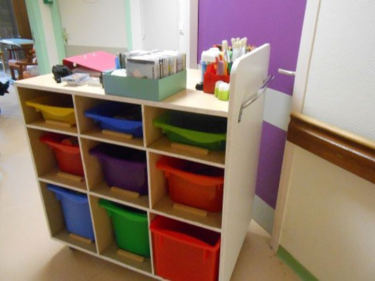 Travaillant sur plusieurs étages avec une salle d’animation au rez-de-chaussée, Aurore a eu l’idée de créer un chariot d’activités ambulant afin de déplacer facilement son matériel d’animation sur différents niveaux. Ce chariot permet aussi et surtout de travailler sur le projet personnalisé en proposant des animations en chambre basée sur l’envie « du moment ». A partir du Partage d'expérience d'Aurore, Thomas, un animateur des Hautes-Alpes, a réalisé les plans du chariot qui sont également à télécharger.