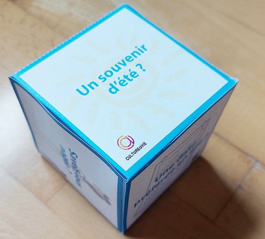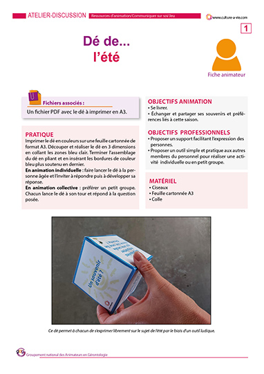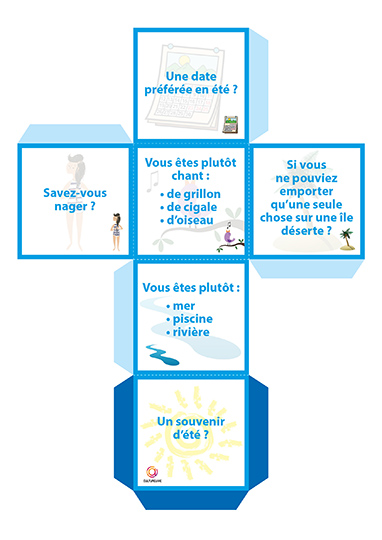 Ce dé à confectionner en carton permet de passer un moment convivial autour du jeu. Conçu pour être utilisé en individuel afin d’échanger sur un thème donné (ici l’été), ce jeu peut également être utilisé en petit groupe afin d’ouvrir les échanges. Le principe est simple, on lance le dé et on répond à la question sur le thème de l’été en partageant un souvenir, une préférence ou une anecdote.