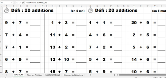 Guillaume a astucieusement créé un fichier Excel qui permet de proposer des additions et des multiplications en aléatoire avec des chiffres allant de 1 à 20. Si besoin des feuilles réponses vous permettront de valider ou non les réponses des personnes. La fiche animateur vous aiguille sur le fonctionnement de ce fichier. Il va de soi que vous ne pourrez pas utiliser ce contenu si vous ne disposez pas d’Excel. Dezippez le dossier pour utiliser le fichier.