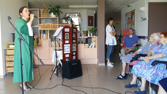 Michèle propose un répertoire de chansons d'hier et d'aujourd'hui, soit en solo avec bandes son, soit en duo voix et guitare (plus vivant, plus riche). La chanteuse s’adapte au public en reprenant des chansons issues du répertoire de Piaf, des vieilles chansons françaises, mais aussi des années 70 à 90, Gospel, Country, variété française pour faire la fête. Michèle intervient davantage comme invitée qui vient chanter avec les résidents, pour eux et partager un bon moment ensemble que comme une artiste qui vient effectuer un concert. Elle aime partager sa passion et faire briller les yeux de son auditoire. Ce qu’elle réussit sans problème selon les animateurs qui l’ont invité grâce notamment à sa très belle voix. Durée de l’intervention : entre 1 h et 1 h 30 Zone d’intervention : Région Rhône-Alpes (autour de la Drôme et de l'Ardèche) Recommandée par : l’EHPAD du Domaine du Château à Montéléger (26) et Villa Thaïs de Valence (26) Coût de l’intervention : 180 € en solo, 250 € en duo en semaine (plus frais de déplacements au-delà de 30 km) Contacts : mail migrivollat@gmail.com – téléphone : 06.42.93.63.98 site internet www.lhappyquichante.com