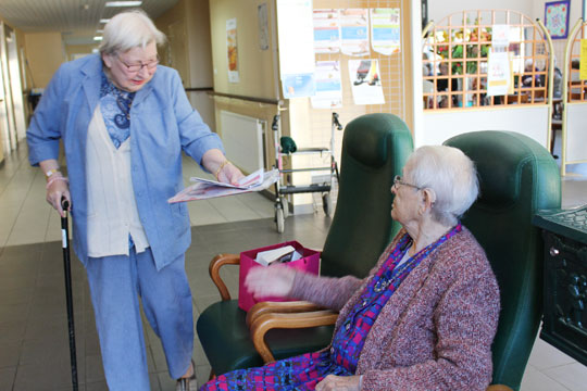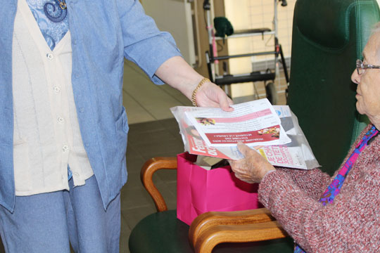 Au sein de notre établissement, un ancien déambulateur a été retravaillé en charriot courrier et lors du passage de l'animatrice, les résidents peuvent l'accompagner pour distribuer le courrier.