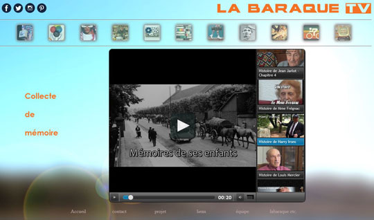 L’association La Baraque a pour objectif de promouvoir les pratiques amateurs. Parmi ses nombreux projets, elle a mis en place une Web TV (la première Web TV amateur de France) où se trouvent, entre autre, des témoignages de personnes racontant leur quotidien durant la seconde guerre mondiale. L’association vous permet de diffuser ses vidéos au sein de vos établissements pour servir de supports à des ateliers-discussions sur cette période difficile de l’histoire. Pour accéder aux vidéos via Internet : www.labaraquetv.fr en allant l’onglet « Aller aux vidéos » puis choisir le picto correspondant à « Collecte de mémoire ». Pour une soirée vidéo vous pouvez acheter le DVD regroupant les témoignages en contactant l’association via leur site.