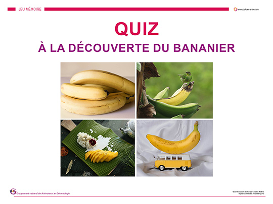 L’animatrice Caroline propose d’en savoir un peu plus sur le 2e fruit préféré des français derrière la pomme, la banane. Trois réponses possibles à chaque question. Les réponses sont données à la suite de chaque question. N’oubliez pas de dézipper le diaporama avant de le projeter.