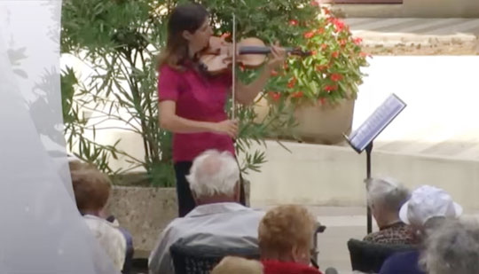 Professeure de musique, Estelle aime partager son amour de la musique avec les personnes vivant en maison de retraite. Accompagnée d'une bande son, elle joue au violon les plus grands standards dans des styles variés (classiques, jazz, chansons, musiques de film, musiques de noël...), pour le plus grand bonheur des résidents. Pour les animateurs qui l’ont reçu, les retours des résidents sont toujours positifs pour son talent mais également pour sa gentillesse. Cette professionnelle sait charmer un auditoire très divers en ayant une petite attention pour chacun en se déplaçant parmi l’auditoire. Durée de votre intervention : 1h environ Zone d’intervention : départements 26 et 07 Le coût de l’intervention : 200€ de coût global (si possible en GUSO) Recommandée par : la Résidence St Antoine à Aubenas (07) et l’Ehpad Le Méridien de Ruoms (07) Contacts : contact@estelle-harbulot.org - 06.22.02.79.55 Site : www.estelle-harbulot.org Lien vidéo : https://www.youtube.com/watch?time_continue=26&v=4JByxjFuGVU