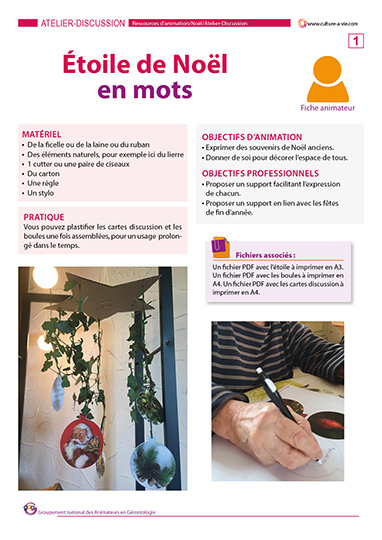 A l’approche de Noël, ce contenu présenté sous forme de mobile, vient questionner les souvenirs de Noël d’Antan auprès des résidents. Des cartes discussion interrogent les résidents afin qu’ils partagent succinctement par écrit leur mémoire sur des boules en papier… Des boules à suspendre à leur étoile, pour décorer les chambres et/ou les espaces communs pour les fêtes. Une fiche animateur explique les étapes du contenu.