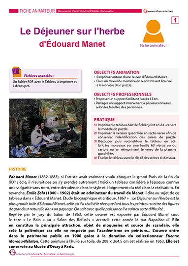 C’est l’été ! L’œuvre « Le déjeuner sur l’herbe » d’Edouard Manet que nous vous invitons à découvrir fait un clin d’œil à la saison, où il fait bon se dénuder un peu… Ce contenu permet dans un premier temps d’étudier cette œuvre avec un commentaire détaillé des figures qui composent le tableau dans la fiche animateur. Dans un second temps vous pouvez imprimer le tableau dans la version puzzle à reconstituer. Les différents éléments du tableau peuvent ensuite faire l’objet d’une exposition dans les lieux communs ou individuels.