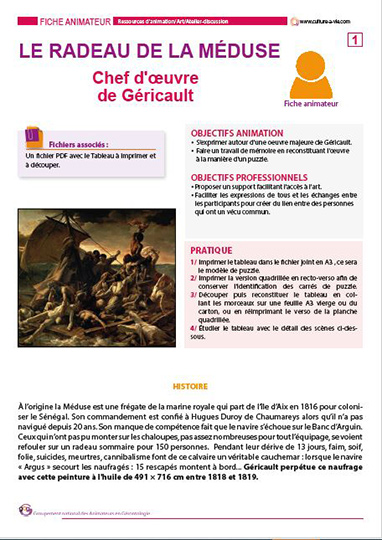Ce support d’animation est dédié à l’étude d’une des œuvres majeures du peintre Géricault, Le radeau de la Méduse. Cette huile sur toile peinte entre 1818 et 1819 mesure 491 × 716 cm et fait référence à la frégate de la marine royale, la Méduse, partie de l’île d’Aix en 1816 pour coloniser le Sénégal. Ce contenu permet dans un premier temps d’étudier cette œuvre avec un commentaire détaillé des figures qui composent le tableau dans la fiche animateur. Dans un second temps vous pouvez imprimer le tableau dans la version puzzle à reconstituer.