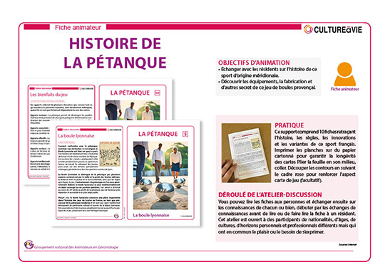 Ce support d’animation pour les personnes âgées se compose de 10 cartes retraçant les origines de la pétanque, les déclinaisons du jeu de boules et les caractéristiques de ce sport. Un petit air provençal pour la saison estivale à partager avec les amateurs/trices de ce jeu.