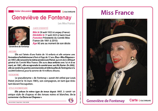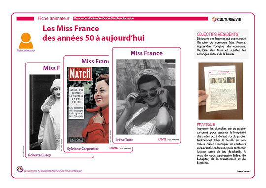 17 cartes reprennent le parcours des Miss France les plus connues de 1950 à nos jours. Ce support permettra de donner suite à l’élection télévisée de la Miss France de l’année diffusée en décembre par un atelier discussion sur la beauté et la place de la femme dans la société.