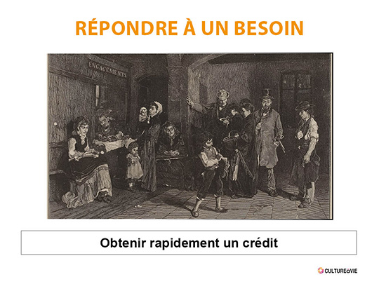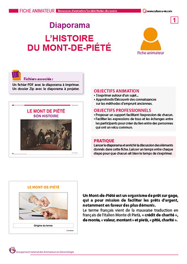 Depuis sa création au XVe siècle en Italie puis au XVIIe siècle en France, ce service de prêt sur gage a évolué en fonction des besoins et de la société mais conserve sa vocation première, permettre à tout à chacun de dégager une somme d’argent rapide sur mise en gage d’un objet. Ce diaporama vous permettra de lancer un atelier discussion avec les personnes âgées autour de la gestion de l’argent et de l’évolution de l’épargne (banques, prêts, taux d’intérêts…).