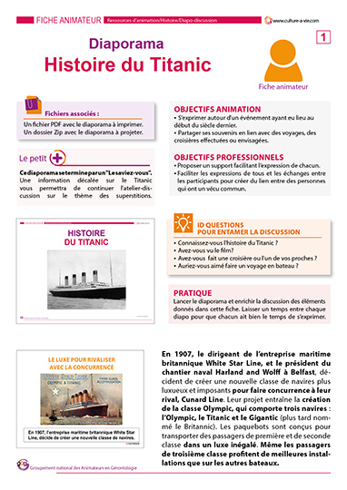 Nous vous proposons un diaporama sur l’histoire de ce paquebot disparu en mer au début du siècle dernier. Ce support d’animation permet d’aborder les souvenirs de chacun sur cet évènement, les conséquences des réussites technologiques pouvant être dépassées par les puissances de la nature à une époque où le progrès scientifique semblait impossible à arrêter. Il peut également faire se remémorer des voyages effectués en bateau.