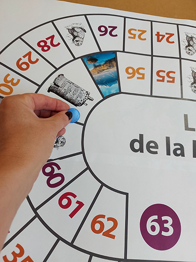Sophie propose un jeu proche d’un autre jeu très connu qui consiste à déplacer son pion au rythme des lancers de dé. Une fiche « cases défis » est à imprimer en plus des morceaux du jeu plateau à imprimer en A3. Le grand format permet à tous les joueurs de bien visionner le plateau. Les questions ou défis font appel à des connaissances générales. Vous pouvez personnaliser ce jeu en incrustant des images de votre ville à la place des paysages donnés ici.