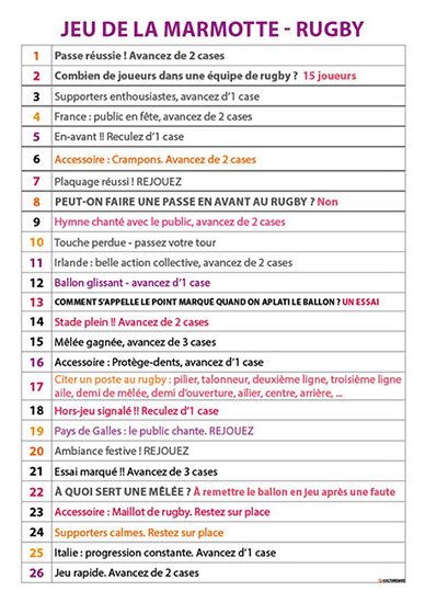 Ce support reprend le jeu de la Marmotte de Sophie décliné sur le thème du rugby. La règle du jeu est celle d’un jeu très connu qui consiste à déplacer son pion au rythme des lancers de dé. Une fiche « cases défis » avec des questions en lien avec le rugby est à imprimer, ainsi que les quatre morceaux du plateau (à imprimer au format A3). Le grand format permet à tous les joueurs de bien visionner le jeu. Les questions feront appel à la mémoire et les consignes permettront de jouer de façon simple et ludique.