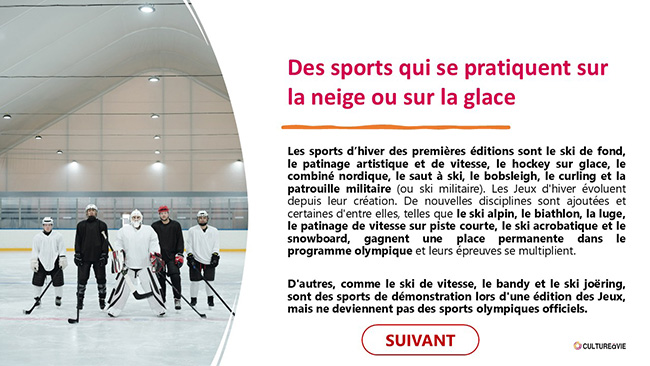 Ce diaporama, accompagné de sa fiche animateur, vous permettra de découvrir (ou redécouvrir) les Jeux Olympiques d’hiver : histoire, sports emblématiques, anecdotes, photos imprimables, vidéos et quiz final. Un contenu idéal pour éveiller la curiosité, échanger des souvenirs et faire voyager les participants à travers les sports d’hiver. Le diaporama est disponible en format PDF mais il ne contient pas les vidéos.