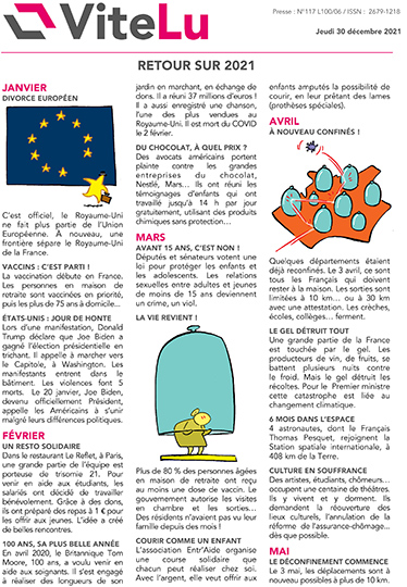 Pour compléter le contenu CULTUREàVIE « Quiz événements 2021 », notre partenaire Lilavie a créé un journal dédié à la rétrospective 2021. Merci à Lilavie pour ce partage. ViteLu Séquoia est un journal support à l'animation d’ateliers revue de presse, écriture, mémoire... Il informe et favorise l'expression et le lien social dans les EHPAD, foyers d’hébergement, accueils de jour, à domicile...