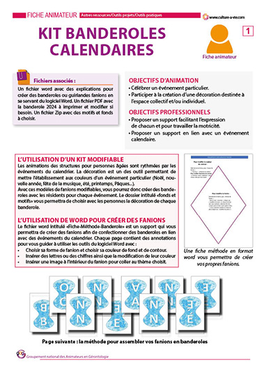 Ce support vous permettra de créer des fanions afin de confectionner des banderoles en lien avec des évènements du calendrier, en utilisant le logiciel Word. L’utilisation des différents outils de ce logiciel vous est expliquée grâce à des exemples complétés d’annotations. La partie confection de la banderole peut être proposée aux résidents pour le choix des motifs, la découpe, le collage des fanions. Une banderole pour fêter l’année 2004 est jointe en fichier PDF. Des fonds et motifs sont également à télécharger pour décorer les fanions à votre convenance.