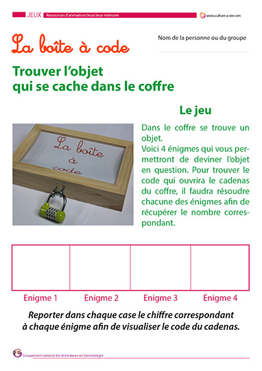 Qui saura trouver le code qui mènera à l’objet à découvrir ? Quatre énigmes mènent chacune à un chiffre qui compose le code de la boîte. Trouver l’intrus, jeu des différences, jeu des syllabes et décryptage d’un texte, des énigmes très ludiques qui permettent de trouver l’objet caché dans la boîte à code.