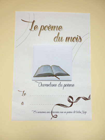 Cet atelier comportera au total 12 poèmes, tous écrits par des auteurs connus ou moins connus. Chaque mois un nouveau poème sera mis en ligne. Le principe est de réaliser un atelier mensuel en prenant le thème abordé dans le poème comme support de discussion en lisant le poème ou en l’écoutant grâce au diaporama son proposé. Le poème du mois est "Le mendiant" de Victor Hugo Tous les poèmes seront à retrouver dans le menu « Ressources d’animation », thème «Littérature », catégorie « Poésie ». N’oubliez pas de « dezipper » le diaporama avant de le projeter