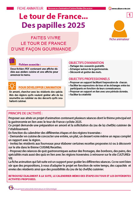 Comme l’an passé, retrouvez un tour de France qui réveille les papilles. Proposez aux aînés un projet d’animation contenant plusieurs séances dont le thème principal est la gastronomie en lien avec le Tour de France cycliste 2025. Ce projet demande une préparation en amont et la sollicitation du (ou de la) chef(fe) cuisinier de l’établissement afin de proposer des menus ou d’aider à la réalisation de recettes en fonction du calendrier des différentes étapes et des régions traversées. Des activités CULTUREàVIE sur le thème de la gastronomie et des régions traversées sont proposées en lien également avec les étapes du Tour.