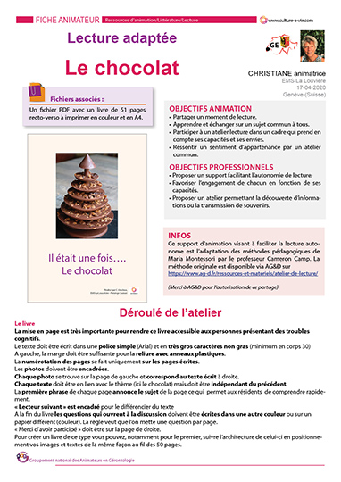Ce livre, créé par Christiane, animatrice suisse, sur le thème du chocolat, est destiné aux personnes présentant des troubles cognitifs. Inspiré de la méthode Montessori, ce livre permet une lecture autonome lors d’un atelier lecture. Christiane donne, dans la fiche animateur la manière dont elle utilise ce support afin que chacun puisse se sentir valorisé et avoir un sentiment d’appartenance à un groupe.