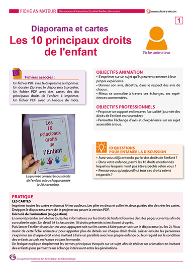 La journée des droits de l’enfant étant en novembre nous proposons ici aux aînés d’échanger sur ce sujet qui a beaucoup évolué depuis leur génération d’enfant à aujourd’hui. Différents supports tels qu’un diaporama, des cartes, un lexique et une fiche animation avec l’histoire des droits de l’enfant vous permettront d’animer un atelier discussion sur ce thème.