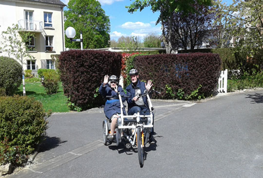 Claire relate ici comment l’achat de tricycles électriques au sein de l’établissement a permis de proposer un type de sortie originale et personnalisée. Accompagné d’un bénévole, d’un membre de sa famille ou d’un membre du personnel le résident peut profiter d’un moment privilégié pour faire une balade ou se rendre à un rendez-vous. Les discussions en route sont toujours très profitables pour en savoir un peu plus sur la vie de chaque personne.