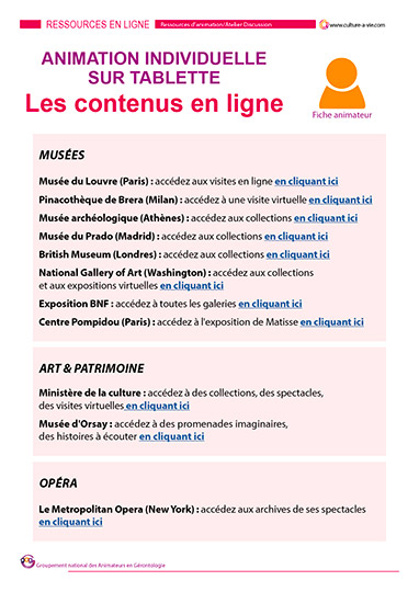 En cette période de crise sanitaire, le Ministère de la culture et de nombreux autres sites mettent à disposition des contenus en ligne gratuits. Ces contenus permettent aux résidents de consulter sur tablette, de leur chambre, des thèmes correspondants à leur envie du moment : visite de musées, opéra, cinéma, documentaire, lecture…