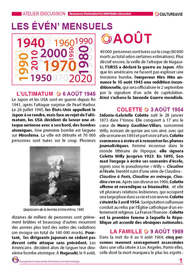 Ce contenu revient sur des événements qui se sont passés pendant les mois d’août entre 1940 et 2020. Des événements pour lancer des débats et pour inviter les résidents de vos établissements à partager leurs souvenirs. Les résidents pourront laisser un écrit en dernière page sur un fait qui ne figure pas au contenu ou un témoignage sur un événement abordé.