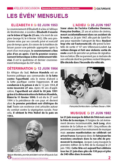 Ce contenu revient sur des événements qui se sont passés pendant les mois de juin entre 1940 et 2020. Des événements pour lancer des débats et pour inviter les résidents de vos établissements à partager leurs souvenirs. Les résidents pourront laisser un écrit en dernière page sur un fait qui ne figure pas au contenu ou un témoignage sur un événement abordé.