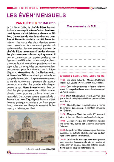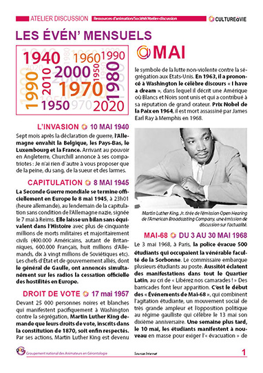 Ce contenu revient sur des événements qui se sont passés pendant les mois de mai entre 1940 et 2020. Des événements pour lancer des débats et pour inviter les résidents de vos établissements à partager leurs souvenirs. Les résidents pourront laisser un écrit en dernière page sur un fait qui ne figure pas au contenu ou un témoignage sur un événement abordé.